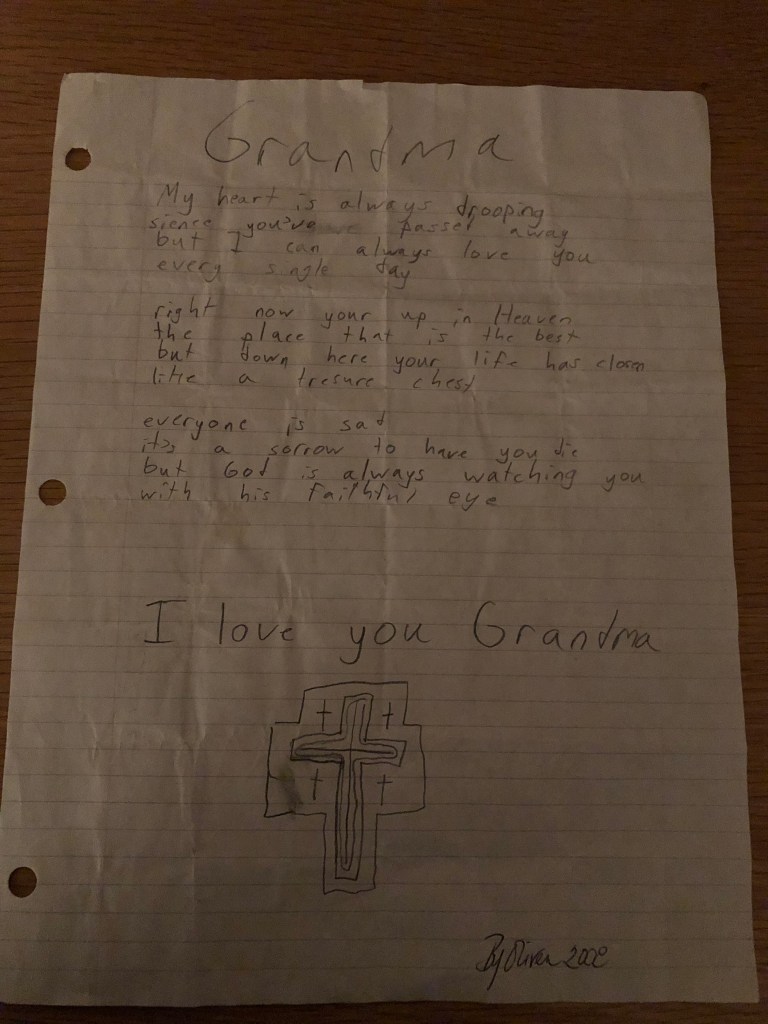 Forward by Oliver’s Mom on January 31, 2021: Writing my tribute to Rose prompted the desire to find and share the poem Oliver wrote for Grandma Peggy’s funeral when he was just nine years old. Although no one told him he needed to write or say anything after his grandma died, he took it upon himself to write this bit of prose that had been folded and refolded multiple times in his pocket until he shared it. Looking back on that heartbreaking time 12 years ago, I am so grateful for my family’s support and their loving tributes to my mom. Tom gave such a heartfelt eulogy that his brother Bill, an orthodox priest, stepped in when it became overly emotional for all of us. Grace confidently played the flute so beautifully to a full church and Oliver spoke from his heart with words beyond his age as seen below.
